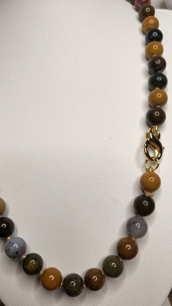 Collier de 48 perles de pierre naturelle en Jaspe Océan Qualité "AA" de 8mm. Enfilage noeud à noeud entre chaque perle, sur fil perlé DMC 37389 beige. Fermoir mousqueton en Laiton doré. Longueur 45 cm. Possibilité de rallonger où diminuer à vos mesures.