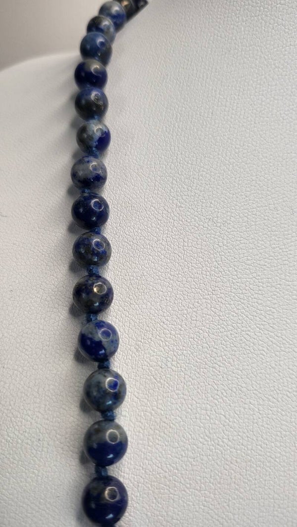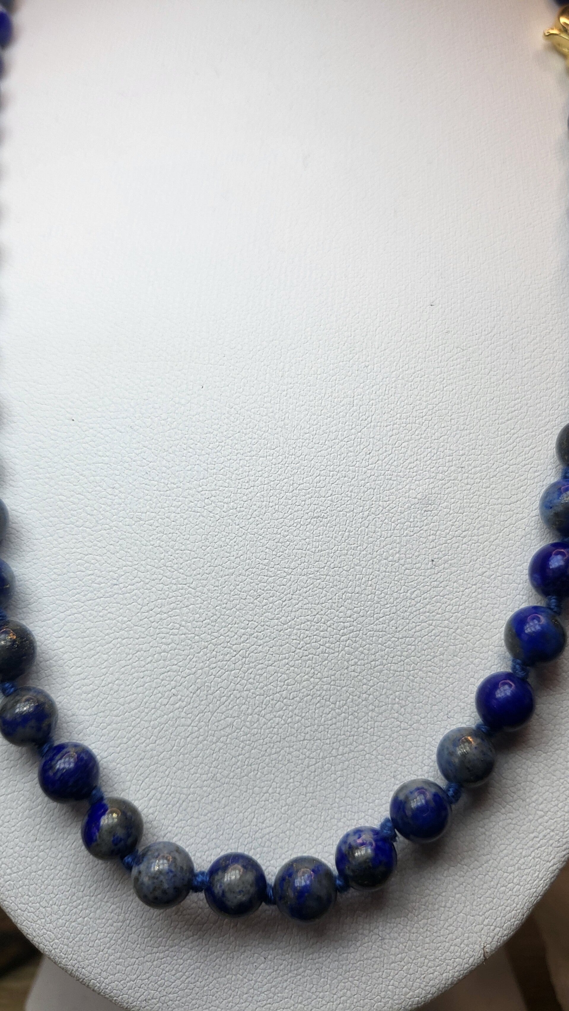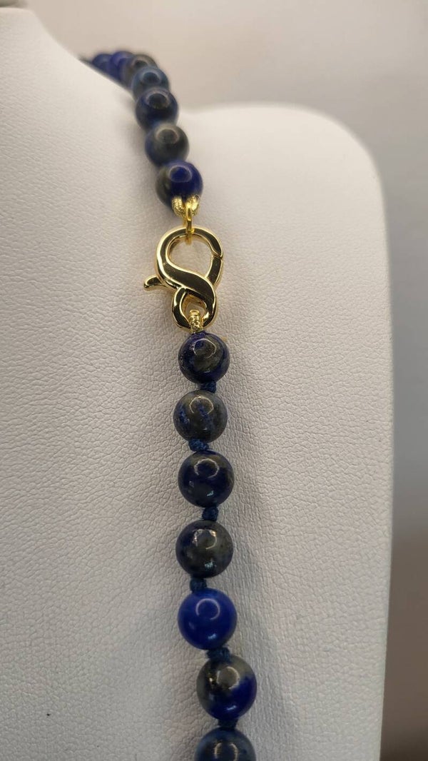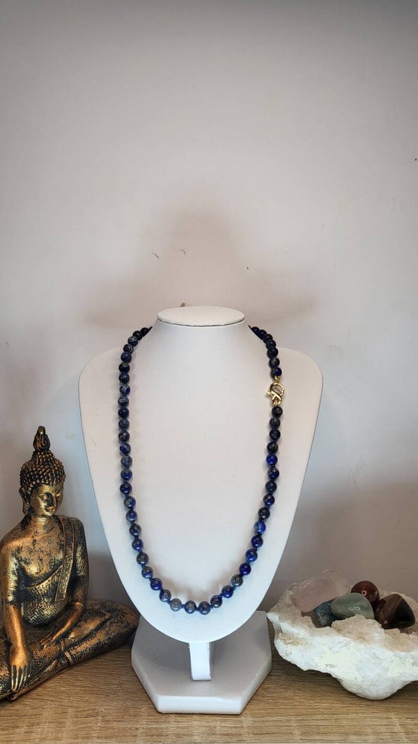 Collier de 60 perles de pierre naturelle en Lapis Lazuli de 6mm provenance d' Afghanistan grade "AAA". Enfilge sur fil perlé DMC 53118 bleu, noeud à noeud entre chaque perle. Fermoir mousqueton Laiton doré.