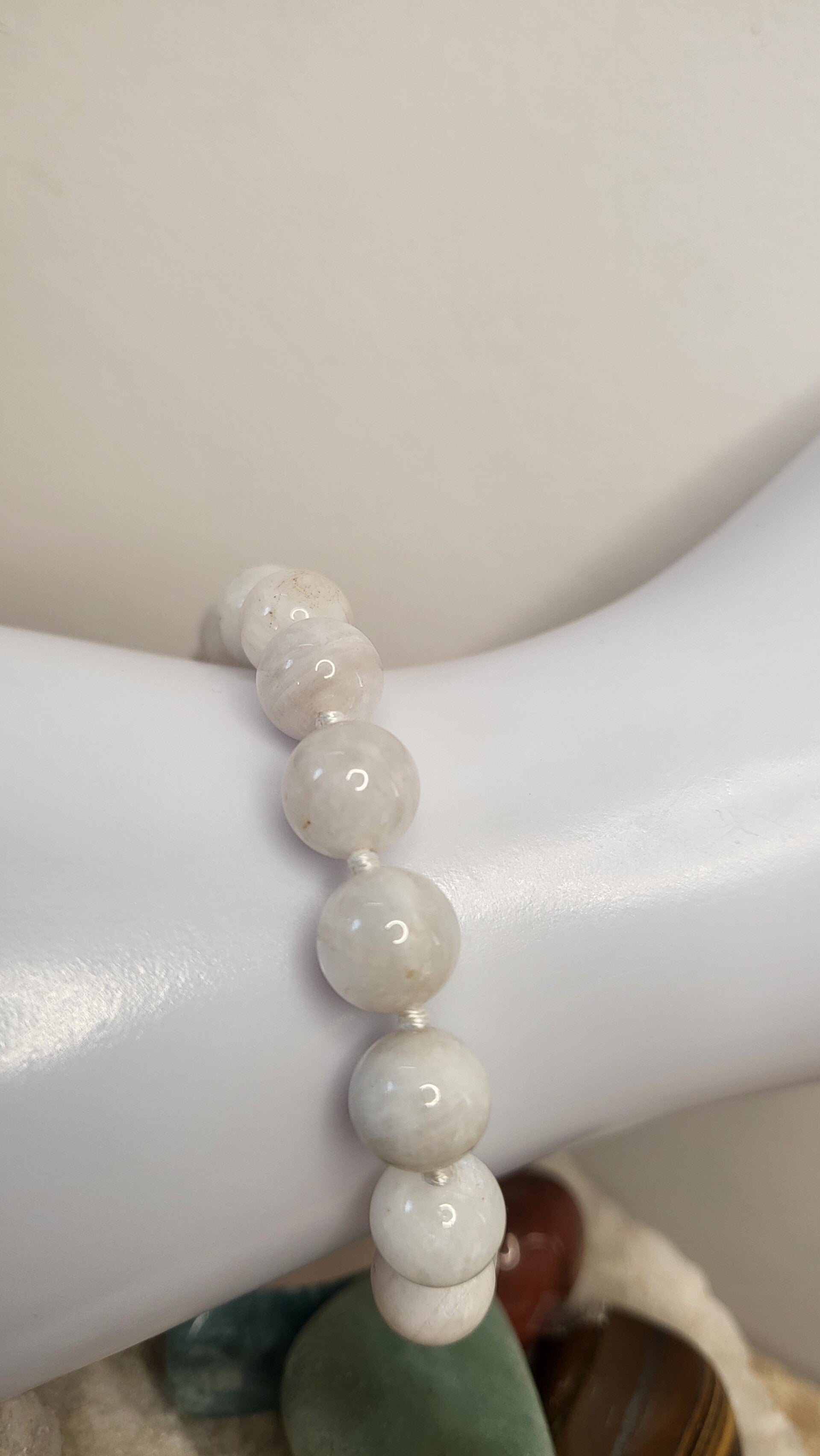 Bracelet de 18 perles de pierre naturelle en Pierre de Lune blanche de 8mm, enfilage sur fil de soie blanc N°28 noeud à noeud entre chaque perle. Fermoir fil de 8 double ouverture en Laiton doré. Longuer 19 cm.