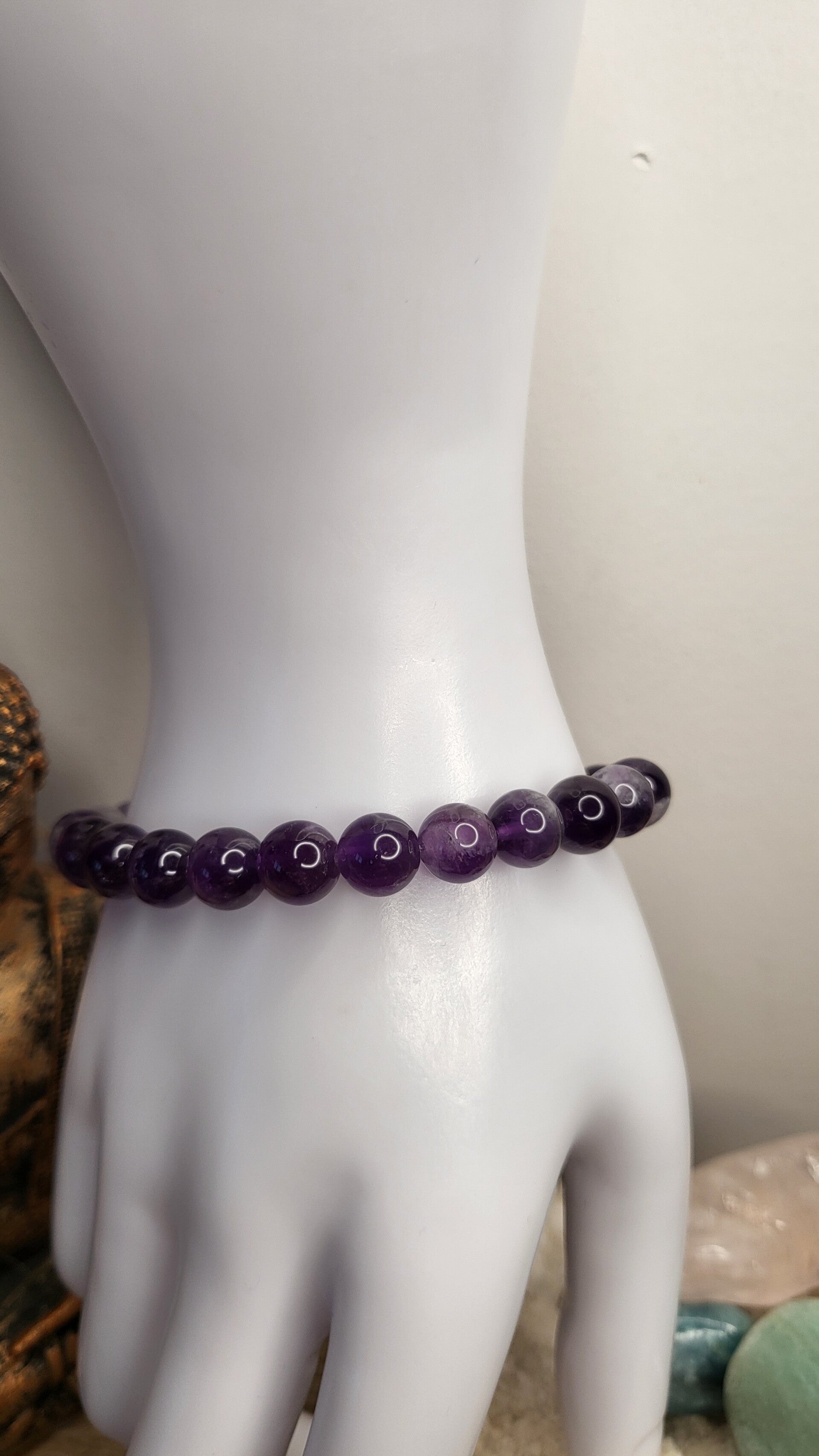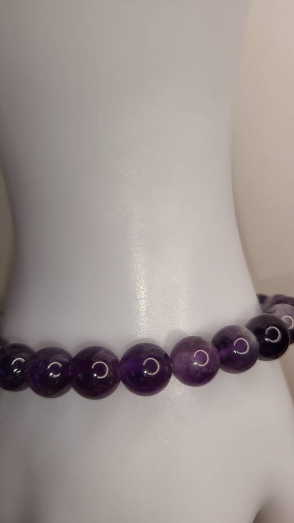 Bracelet de 23 perles de pierre naturelle Améthyste, provenance du Brézil, 8mm, Grade "AA". Montage sur fil élastique transparent de la marque Jewellery. Taille standard 18cm.