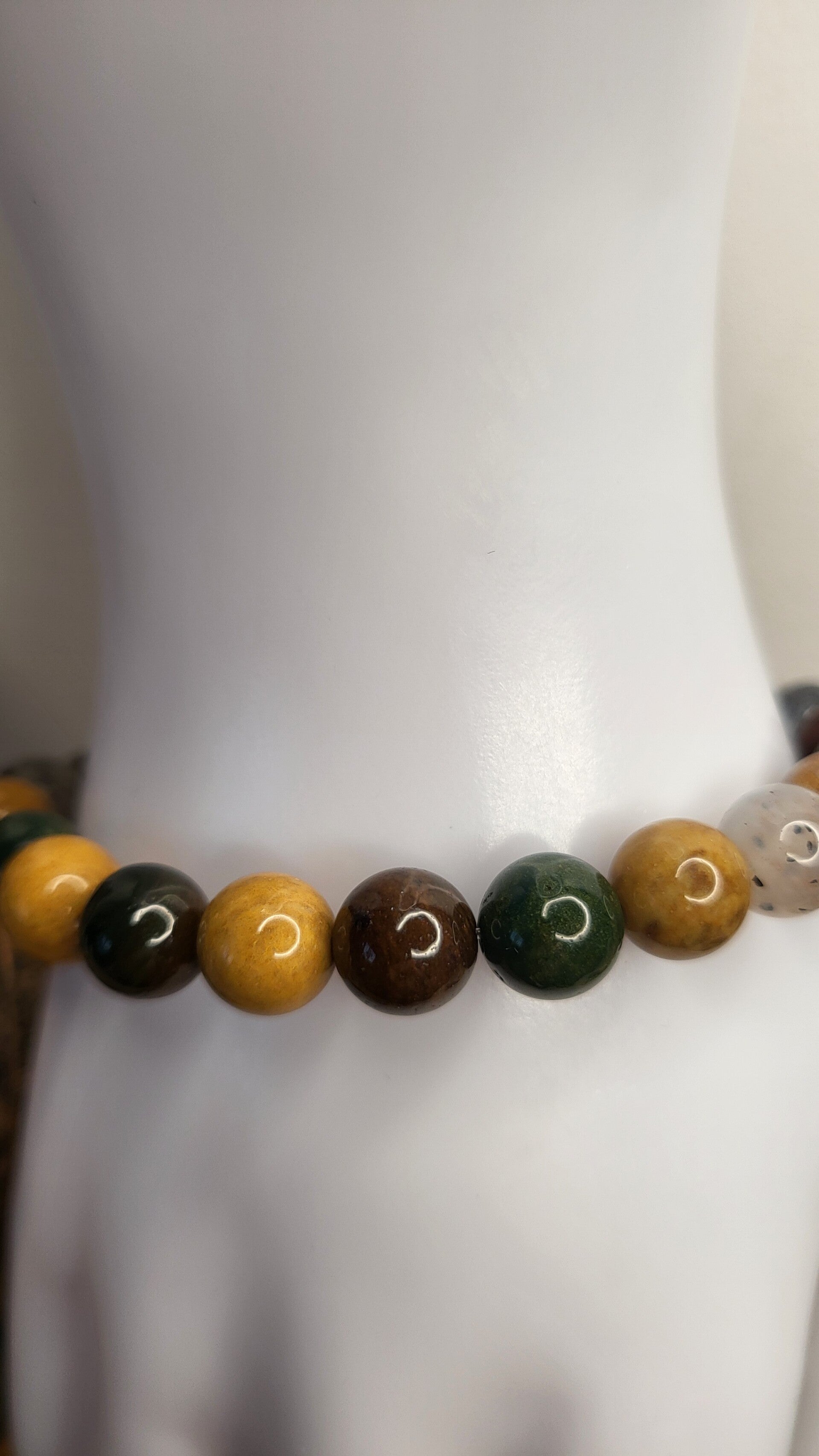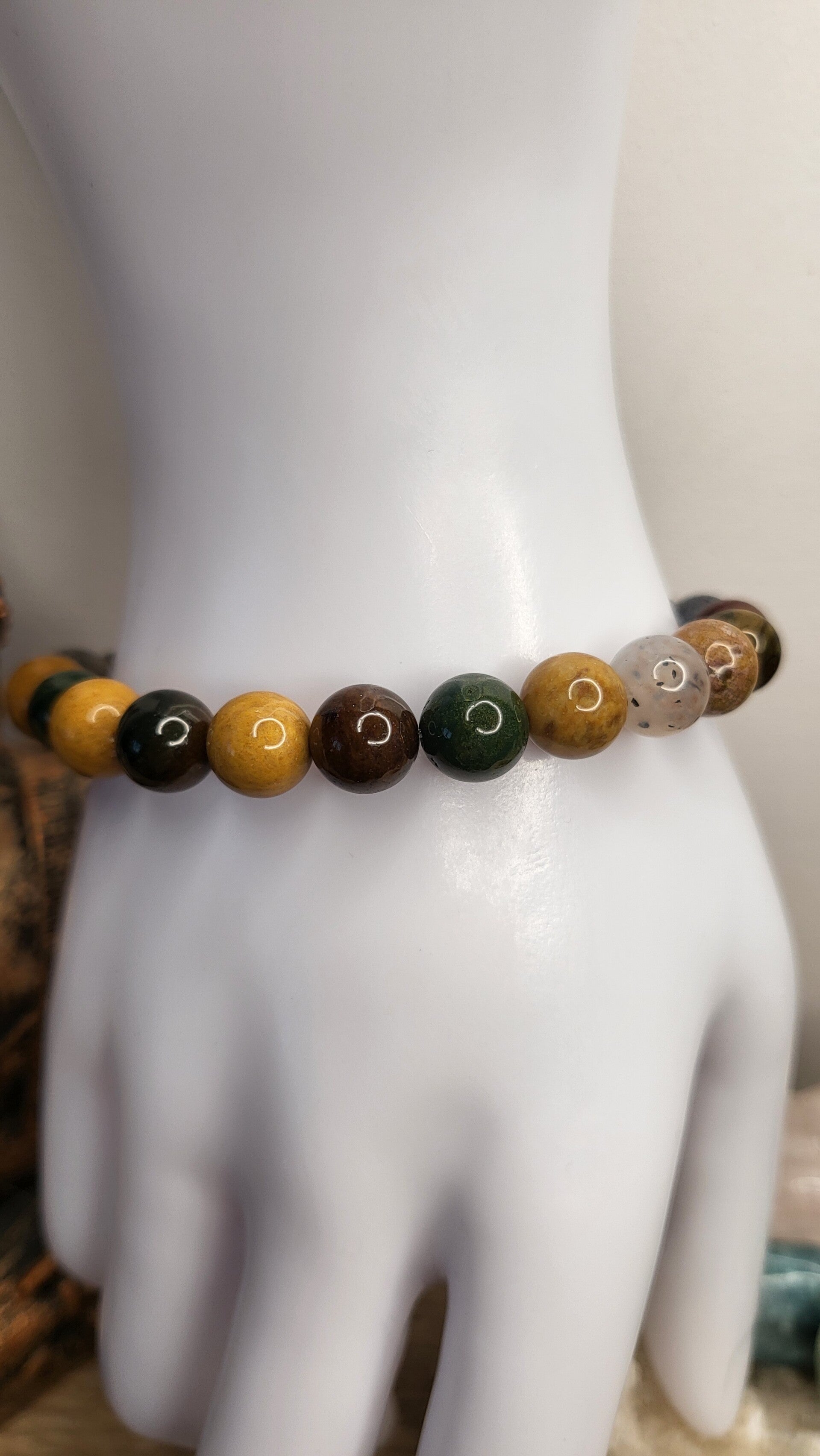 Bracelet de 23 perles de pierre naturelle Jaspe Océan Grade "AA" de 8mm. Montage sur fil élastique transparent de la marque Jewellery. Taille standard 18 cm.