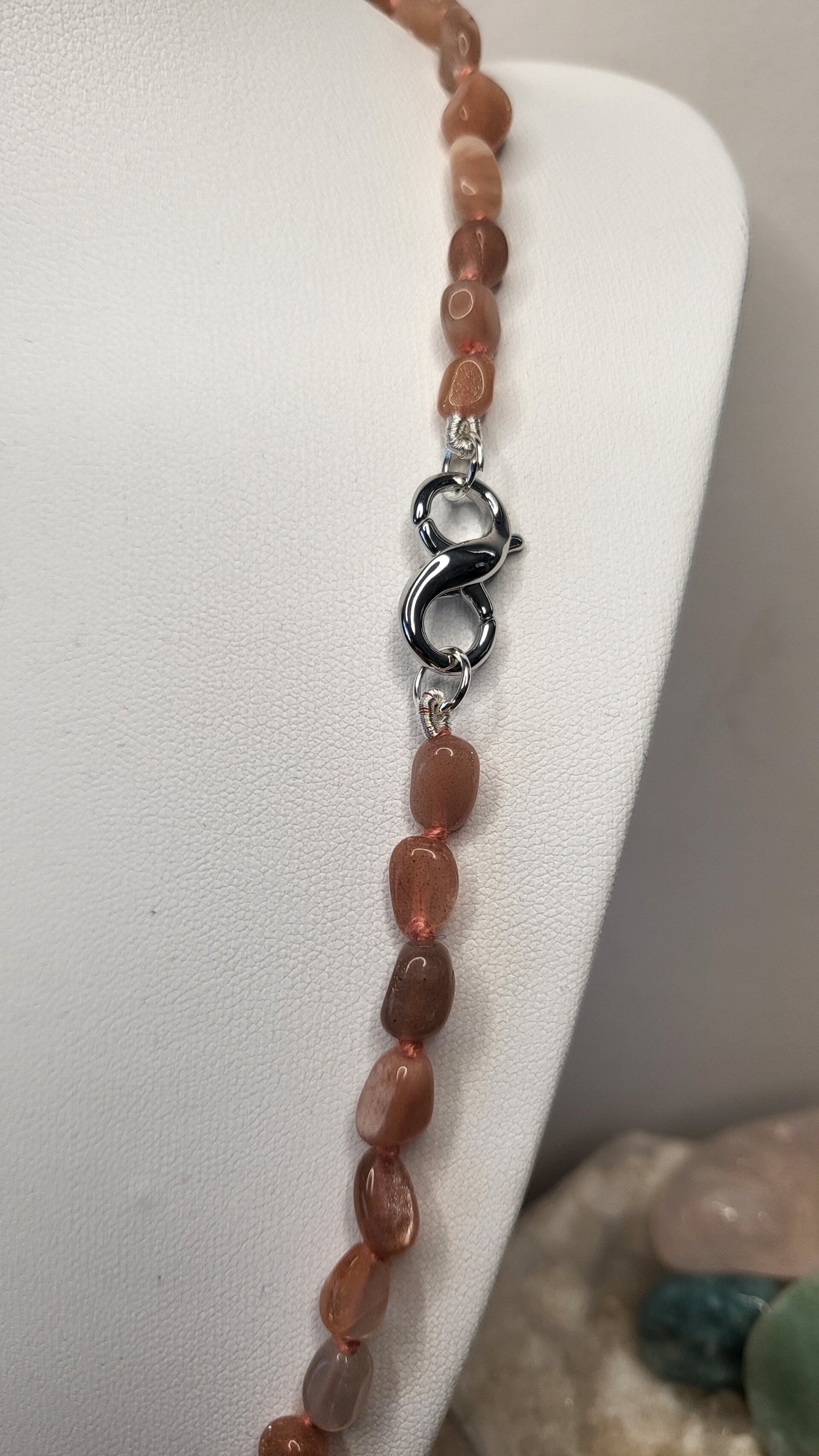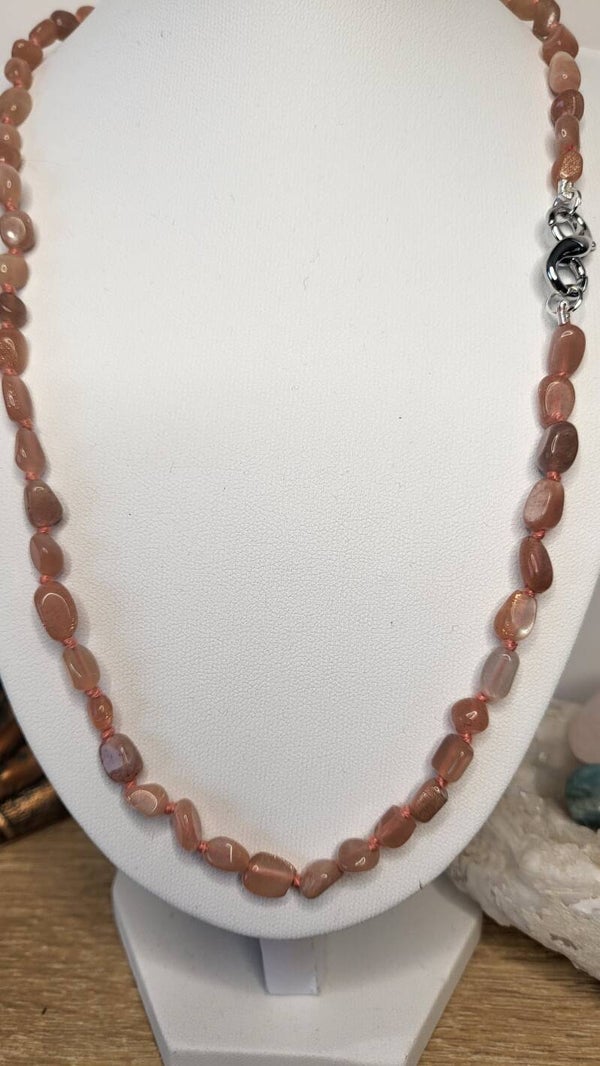 Collier de 58 perles de pierre naturelle de Galet Pierre de Lune orange, Qualité "AA" provenance d'Inde. Enfilage sur fil perlé DMC 93521 noeud à noeud entre chaque perle. fermoir fil de 8 double ouverture en Laiton argenté pour positionner votre pendentif. Longueur 48 cm.
