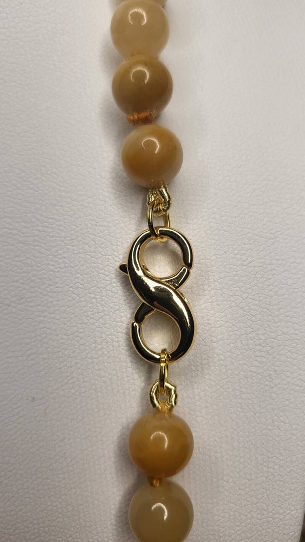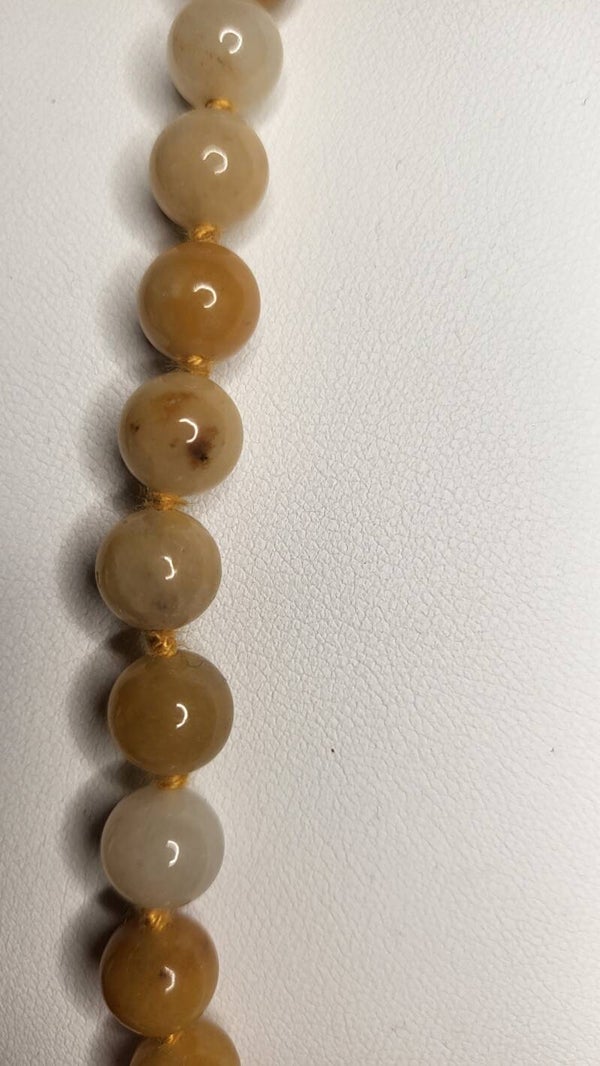 Collier de 47 perles Aventurine Jaune de 8mm classification grade "AA" provenant de Madagascar. Enfilage sur fil perlé DMC 27834 noeud à noeud entre chaque perles. Femoir fil de 8 double ouverture en Laiton dpré, vous permettant de placer un pendentif à votre convenance. Longueur 45 cm.