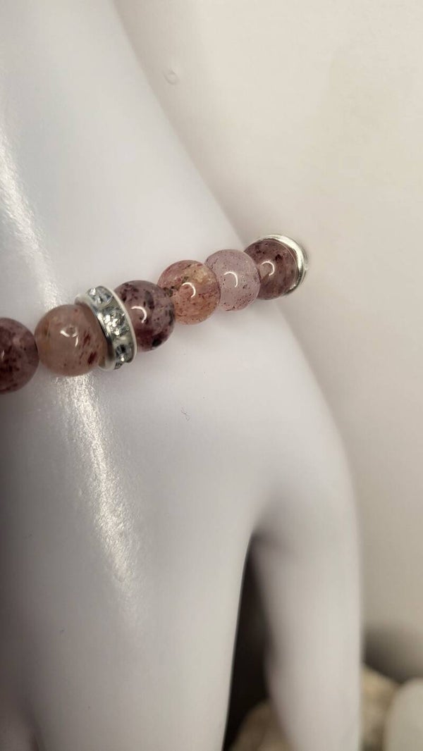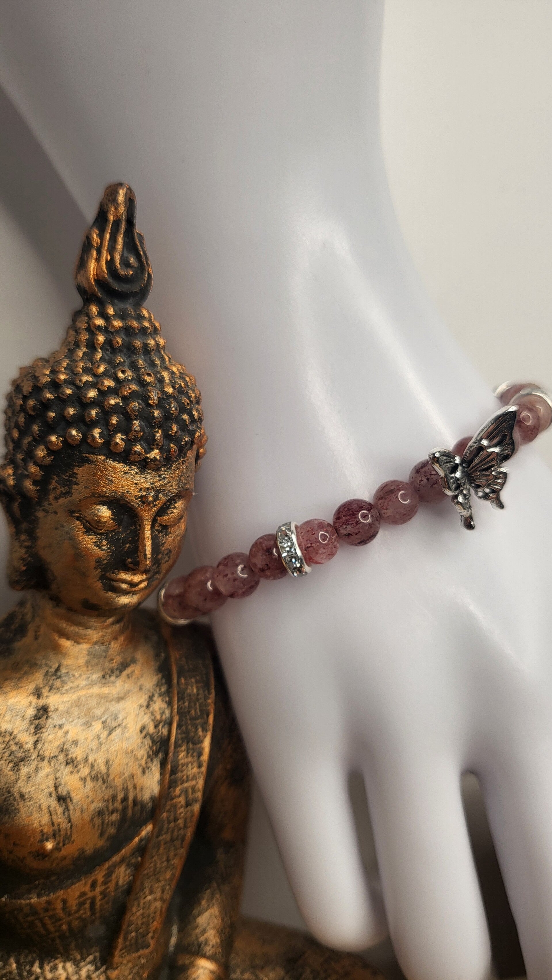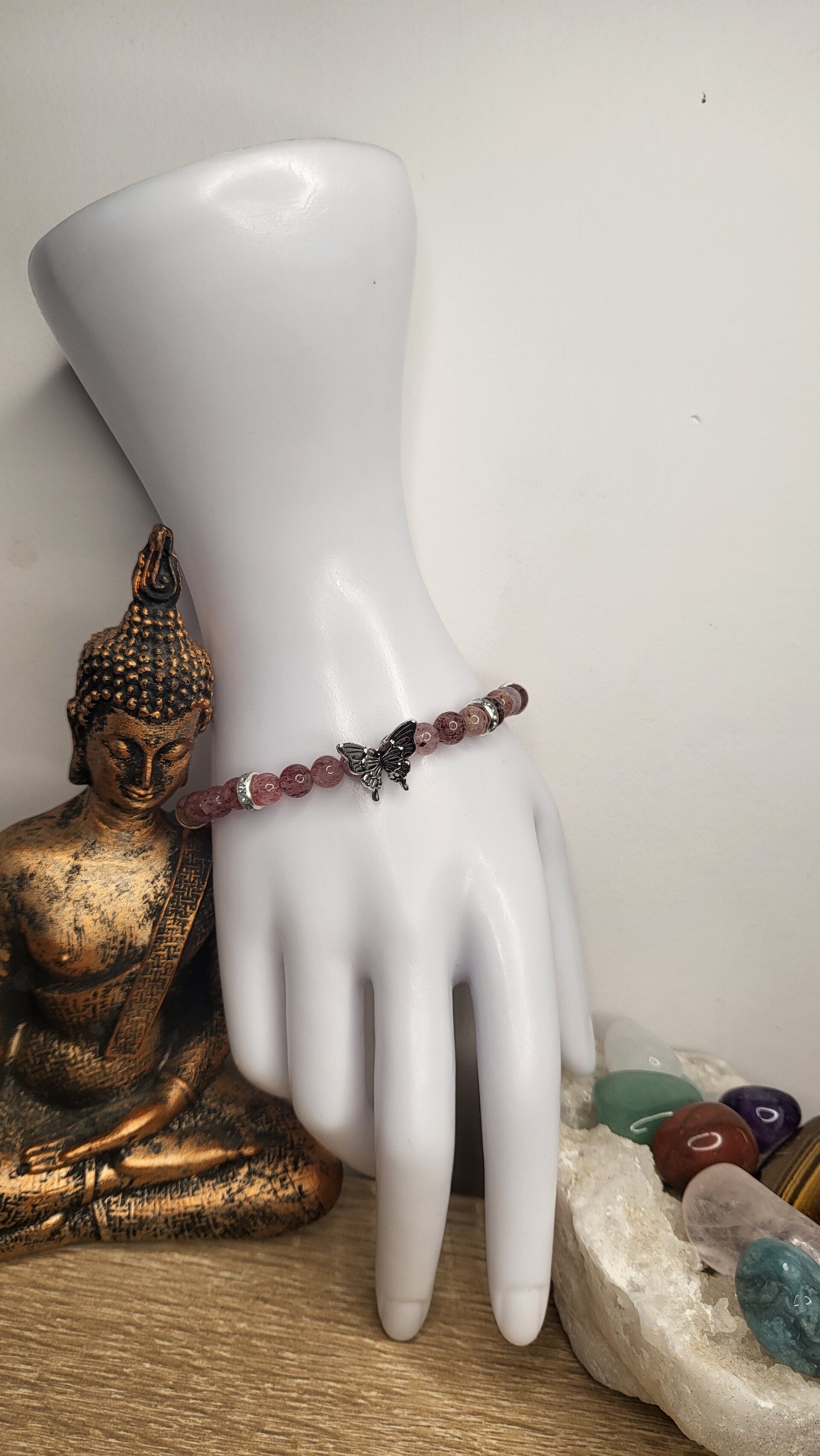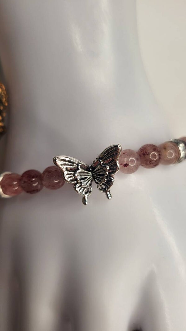 Bracelet de 28 perles de pierre naturelle en Quartz Fraise de 6mm. Qualification du Grade "AA", enfilage sur perlé DMC ref 58157. Ornement central Papillon + 4 separateurs de perles strass, finition avec fermoir mousqueton fil de 8 en alliage métal argenté. Longueur finie 20cm.