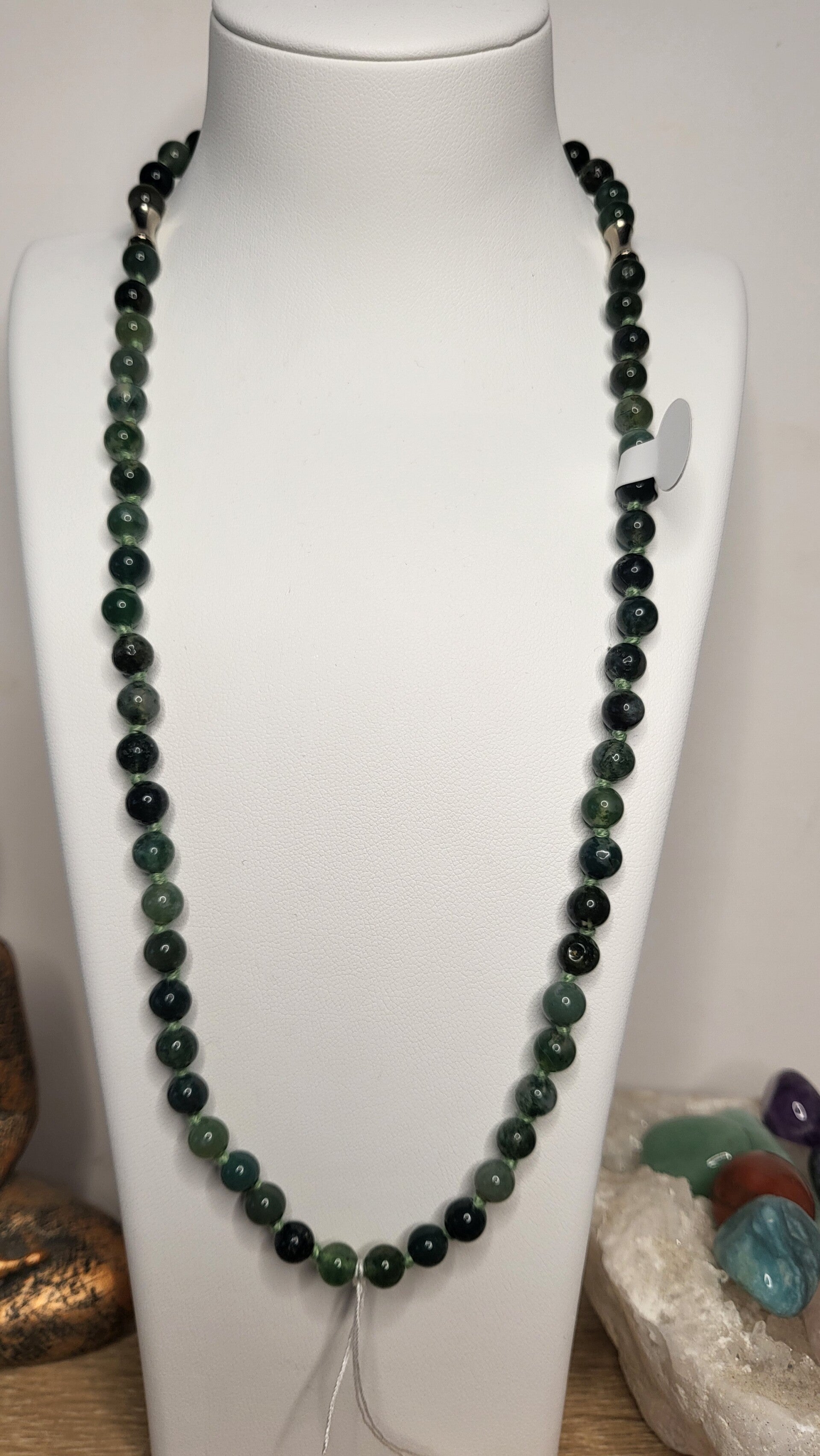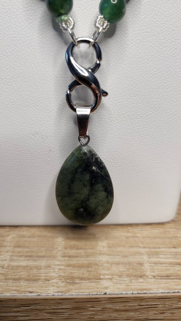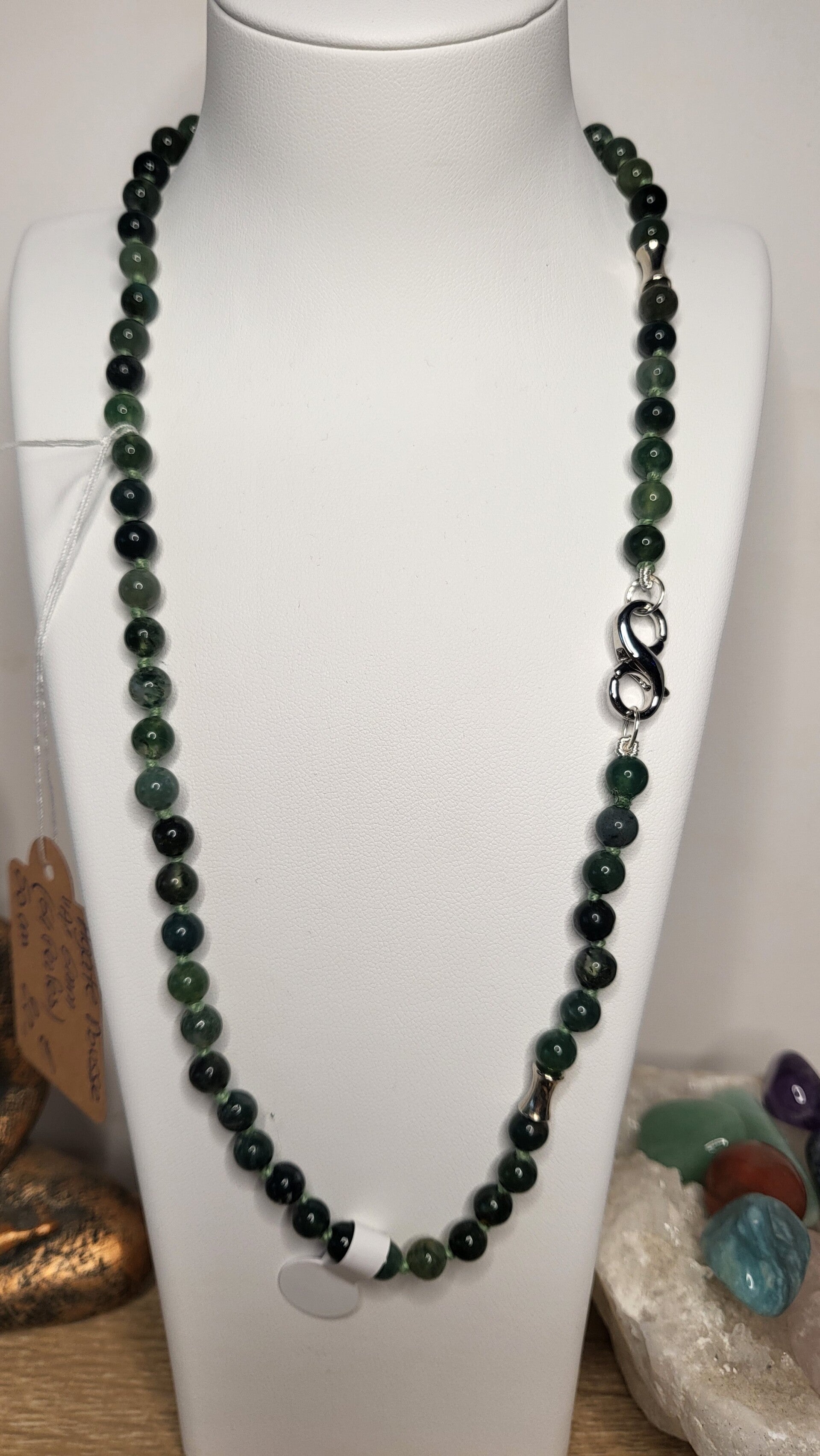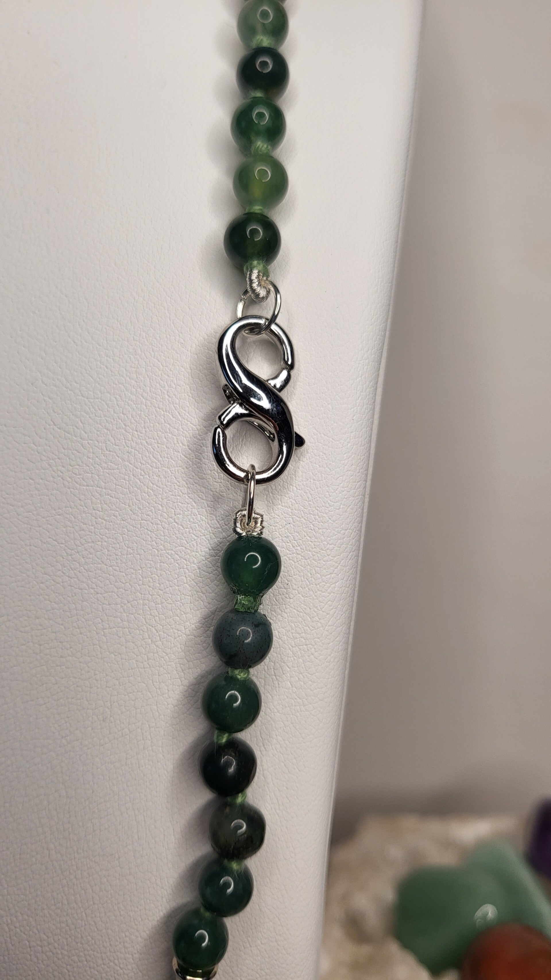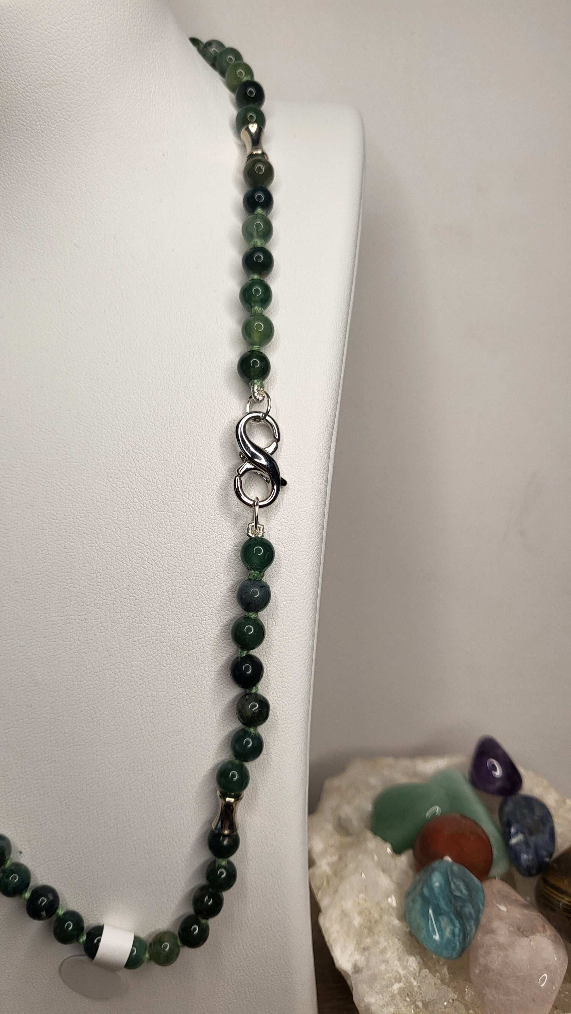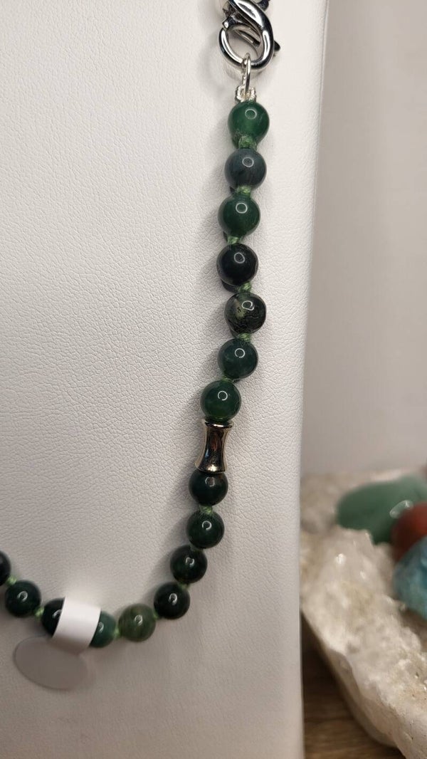 Collier de 64 perles de pierre naturelle en Agate Mousse de 6mm. Qualification du Grade "A", enfilage sur fil DMC 53684 à noeud entre chaque perle, finition avec un mousqueton fil de 8 double ouverture en alliage métal argenté donnant possibilité de placer un pendentif comme celui proposé et fourni, en pierre de verre verte forme goutte entourée de 2 tubes séparateurs de perles alliage métal argenté, ou de le porter simplement fermoir sur le côté ou sur l'avant utilisant le fermoir en ornement, et tout simplement en collier de perles fermoir positionné sur la nuque (voir photos). Longueur finie 50cm. Possibilité de diminuer ou agrandir à vos mesures; n'hésitez pas à nous contacter pour plus d'informations!