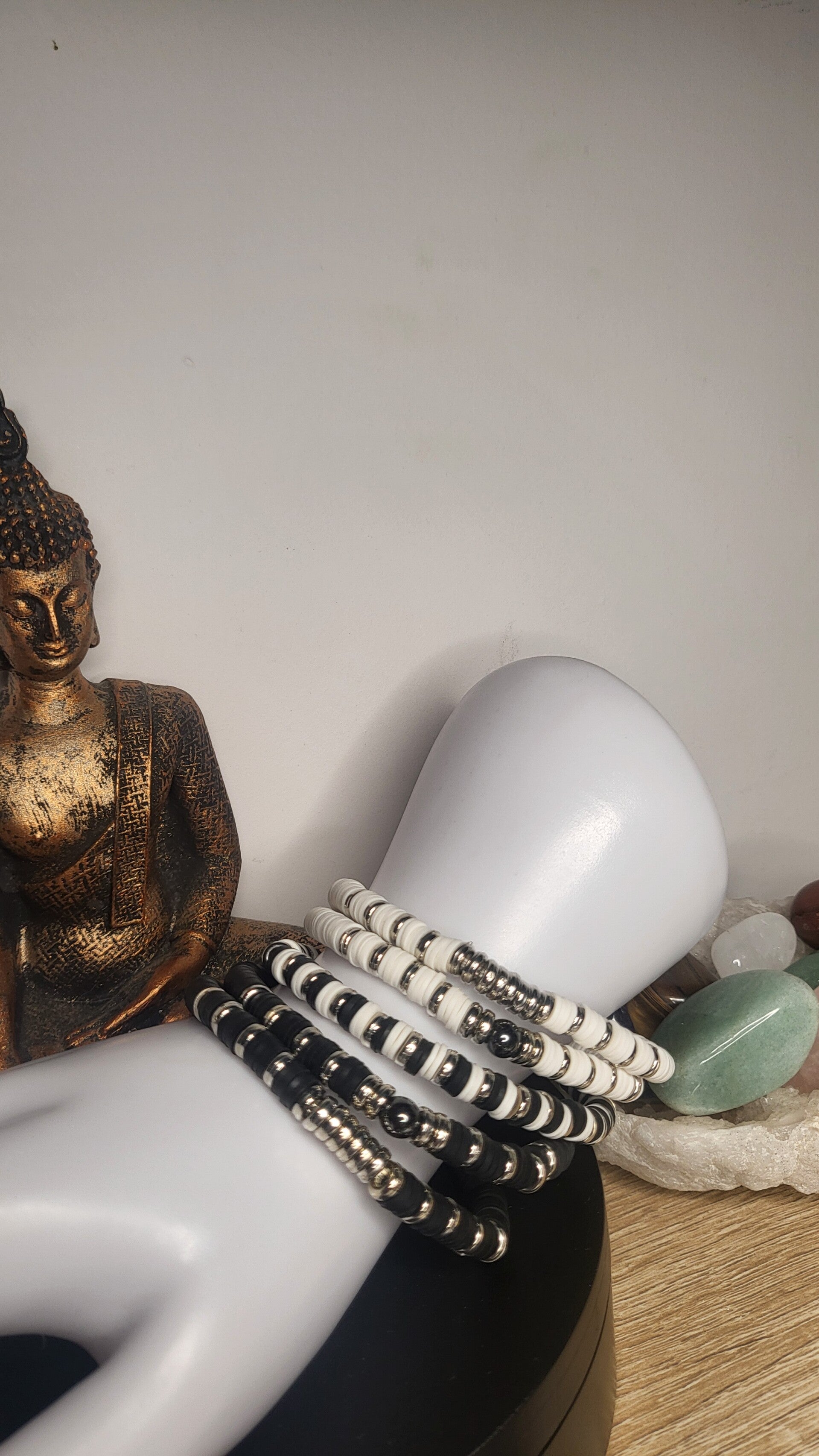 Bracelet noir en rondelle de pâte Fimo- polymère, montage sur fil élastique transparent de la marque Jewellery, agrémenté de séparateurs de perles en rondelle métal argenté. Longueur fini 19cm. Posibilité d'agrandir ou diminuer à vos mesures. Contactez-nous pour plus d'informations!