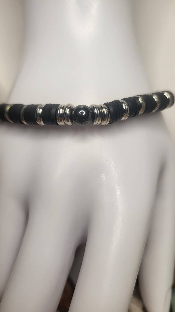 Bracelet noir en rondelle de pâte Fimo-Polymère, montage sur fil élastique transparent de la marque Jewellery, agrémenté de séparateurs de perles en rondelle argenté ainsi qu'une Perle en Hématite de 6mm centrale. Longueur fini 19cm. Posibilité d'agrandir ou diminuer à vos mesures. Contactez-nous pour plus d'informations!