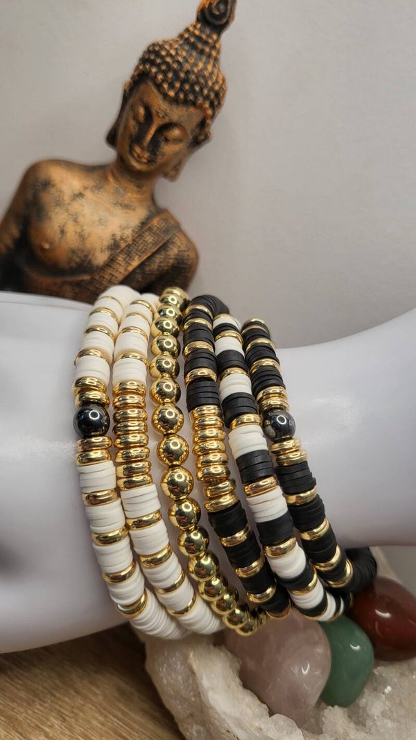 Bracelet noir en rondelle de pâte Fimo- polymère, montage sur fil élastique transparent de la marque Jewellery, agrémenté de séparateurs de perles en rondelle métal doré. Longueur fini 19cm. Posibilité d'agrandir ou diminuer à vos mesures. Contactez-nous pour plus d'informations!