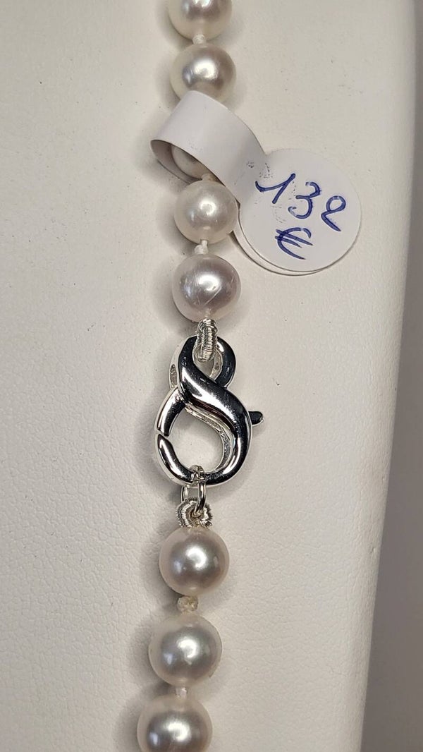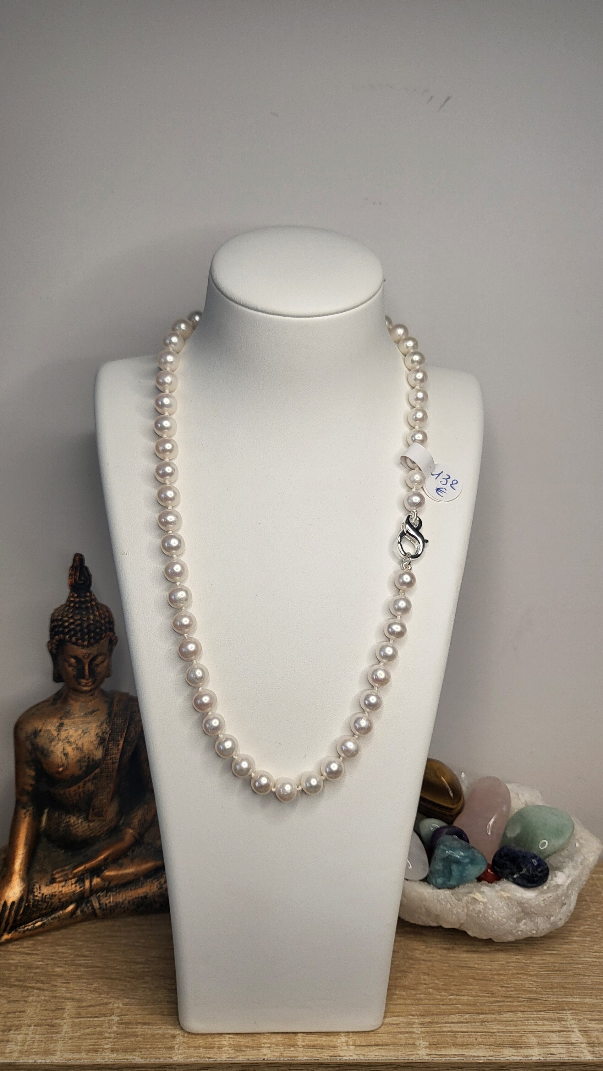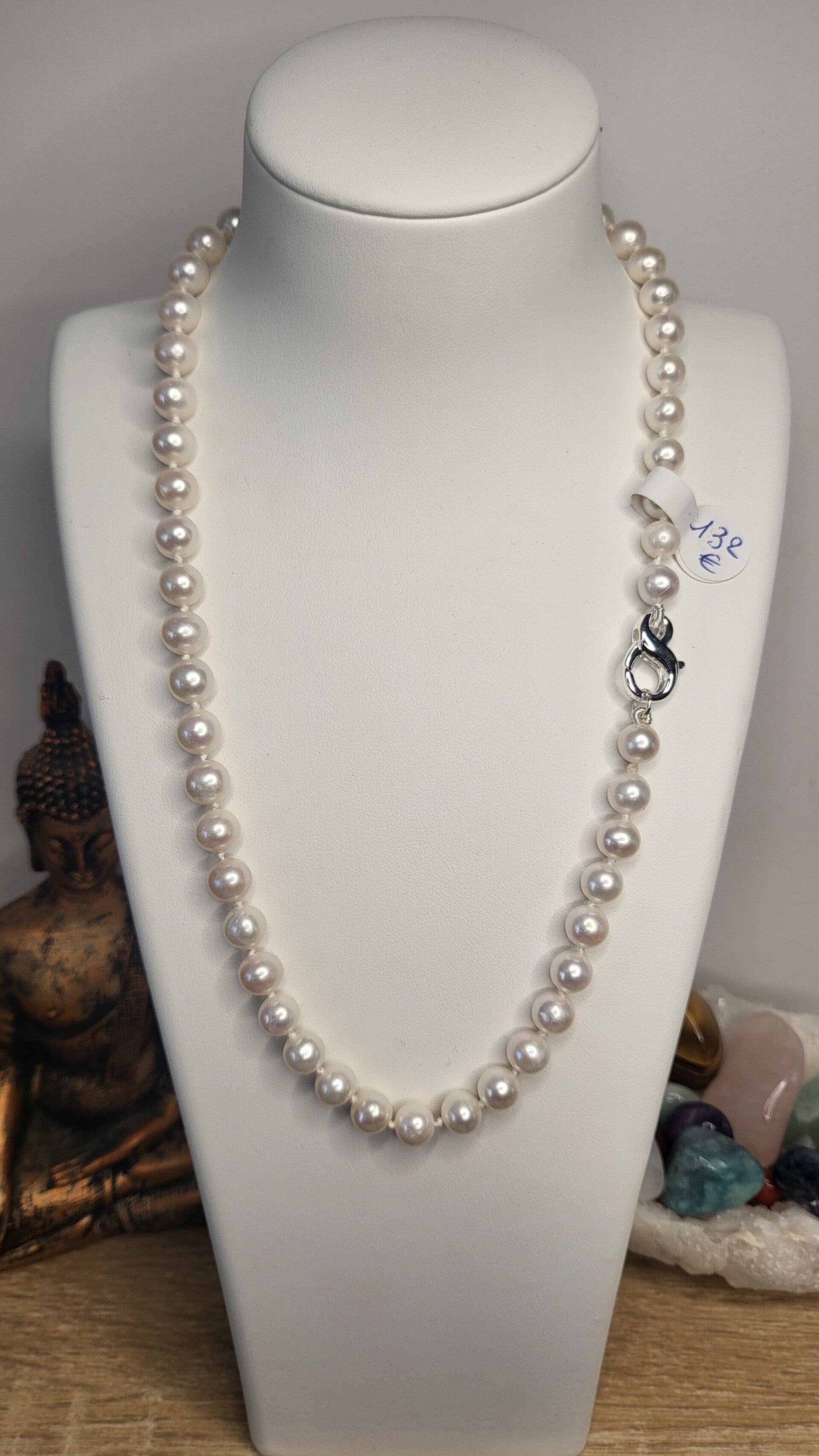 Collier de 52 perles de culture blanche de californie, lisse, ronde, de 8mm qualité du grade "AAA", montage sur fil de soir noeud entre chaque perle, longueur fini 42 cm.
