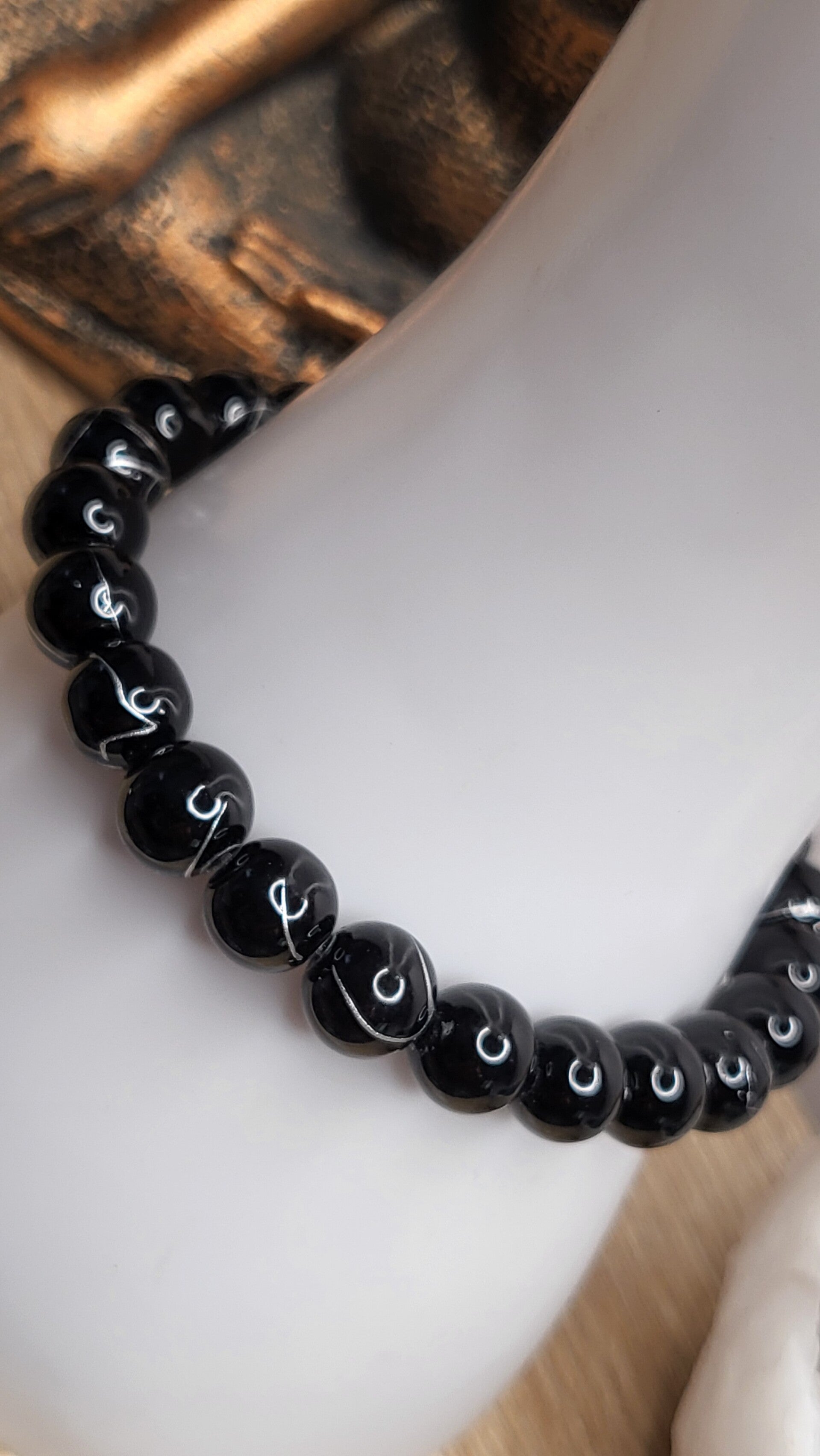 Bracelet standard de 24 perles en acrylique noir fil argenté de 8mm. Montage sur fil élastique de la marque Jewellery de 18 cm fini.