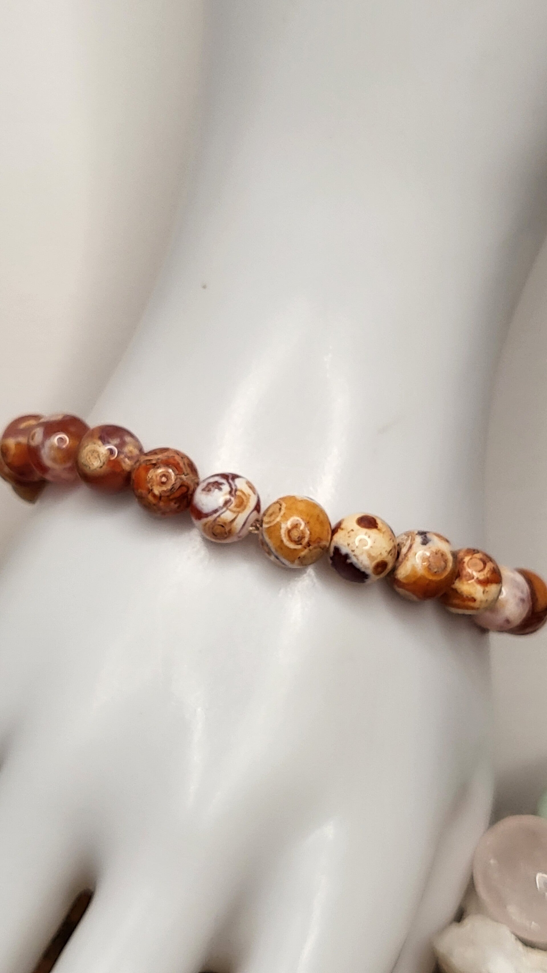 Bracelet standard de 24 perles en Agate Mexicaine véritable de 8mm. Montage sur fil élastique de la marque Jewellery. Taille standard 18cm.