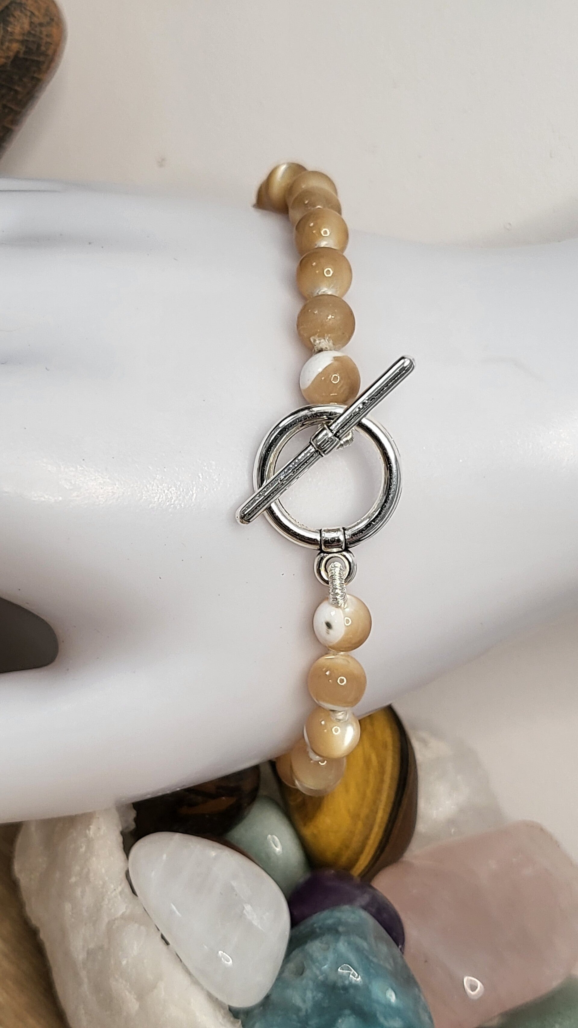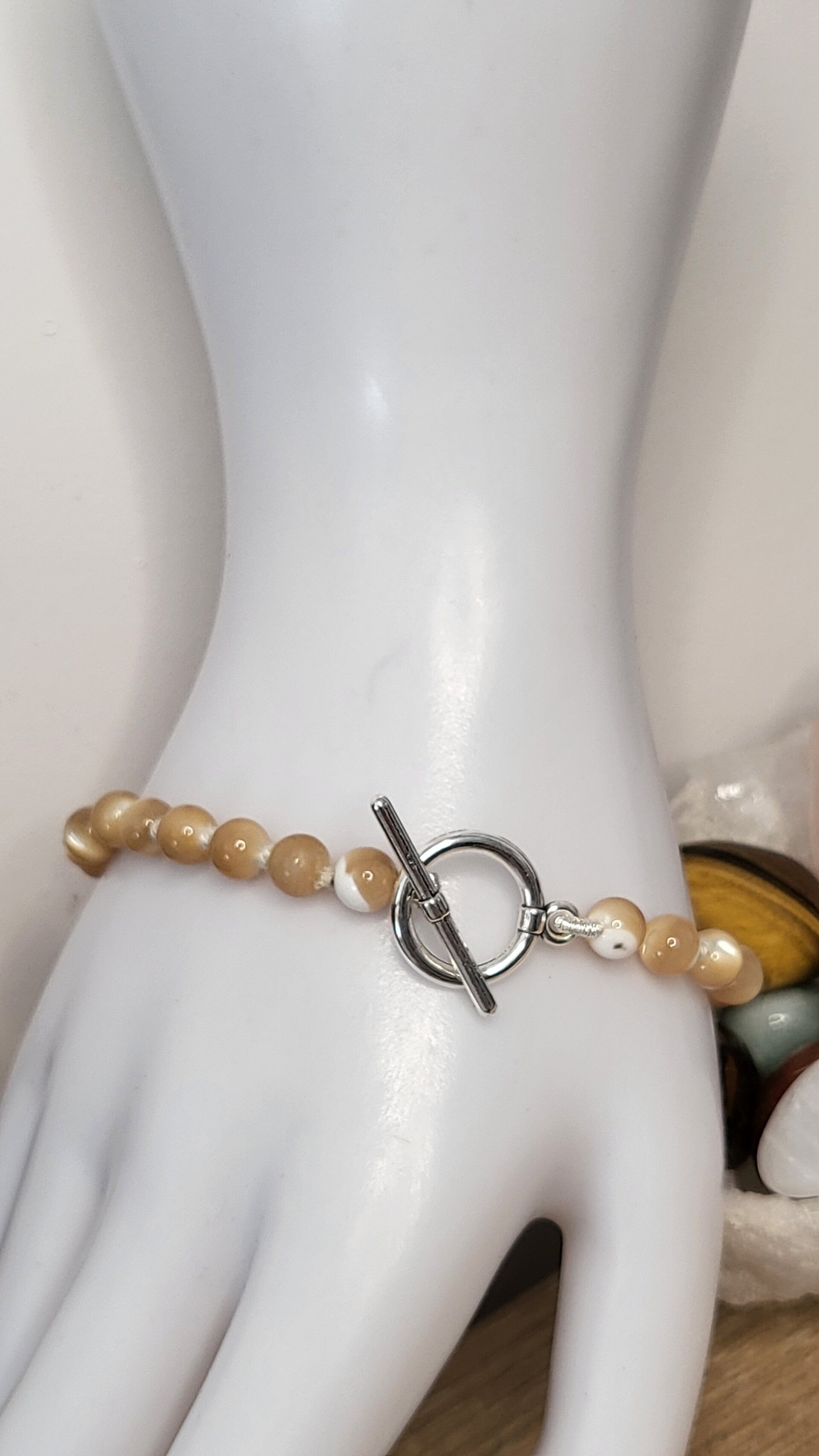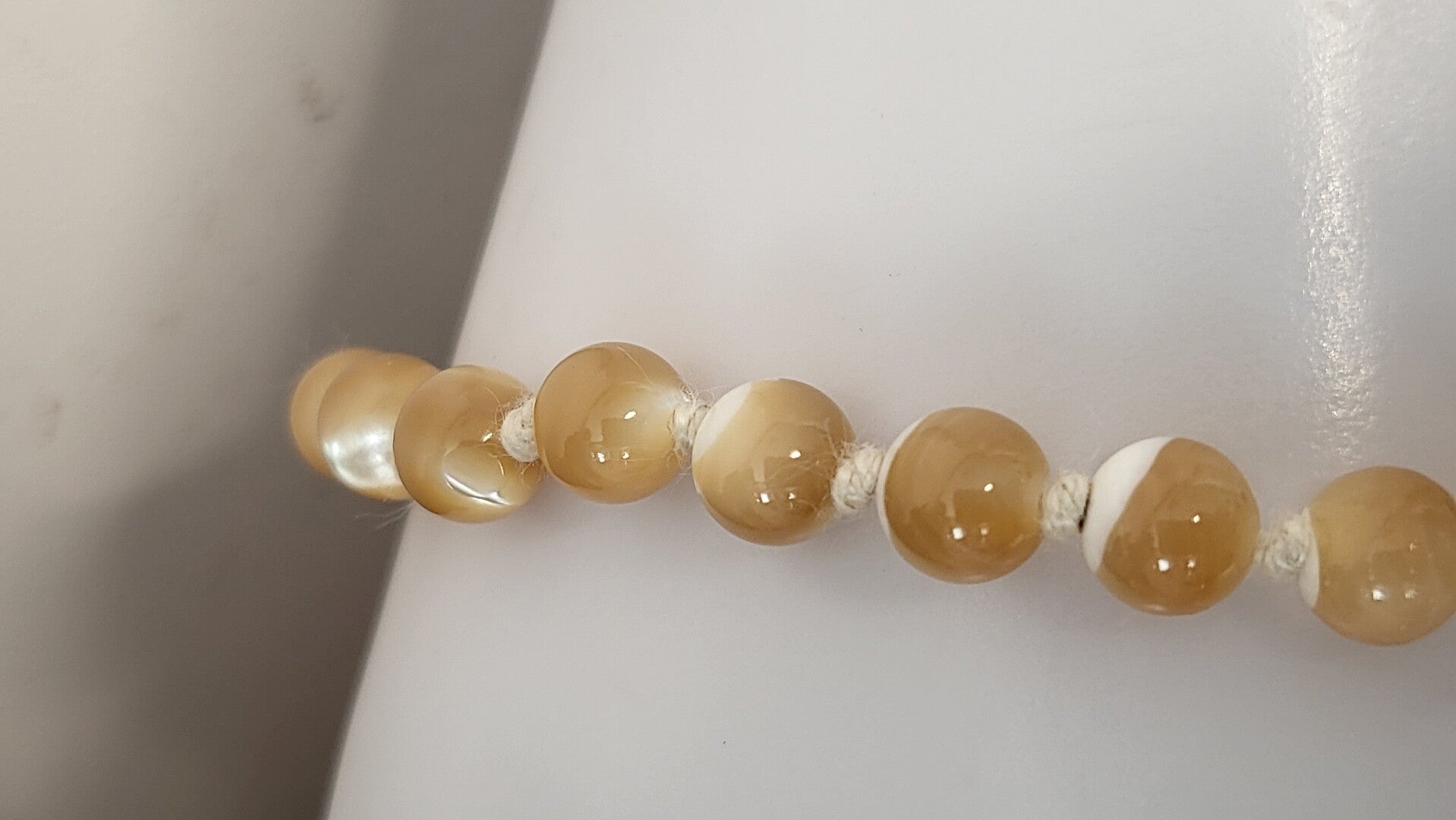 Bracelet de 26 perles de nacre naturelle de 6 mm. Montage sur fil DMC perlé écru à noeud entre chaque perle. Longueur de 20cm. Fermoir en alliage métal argenté "Style Hermès.