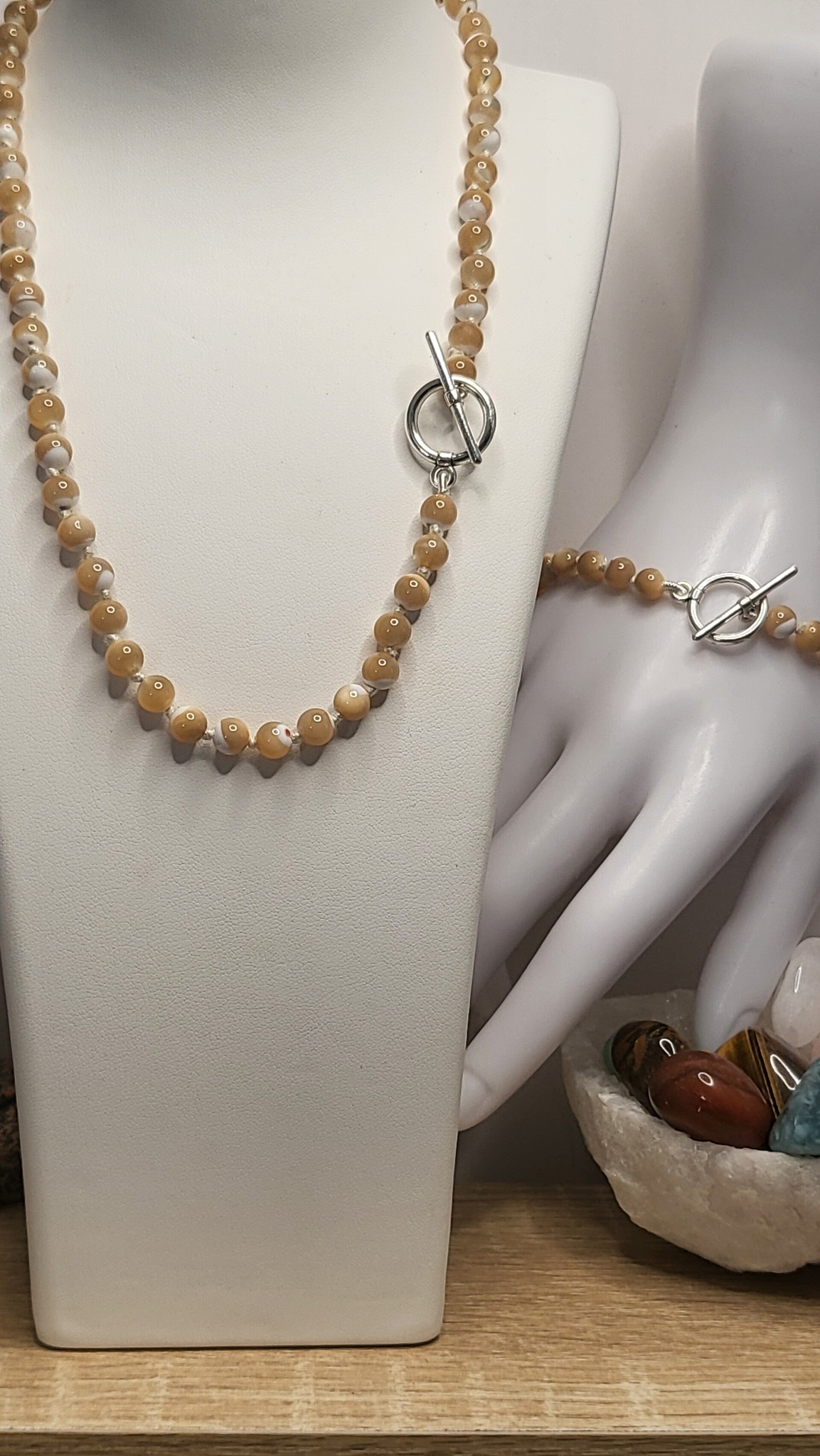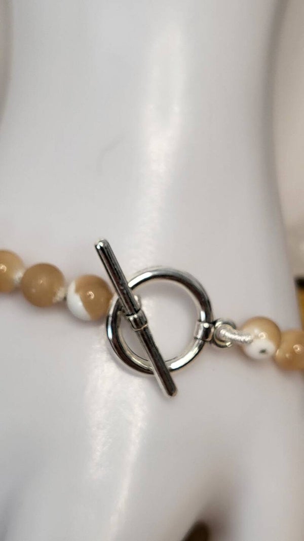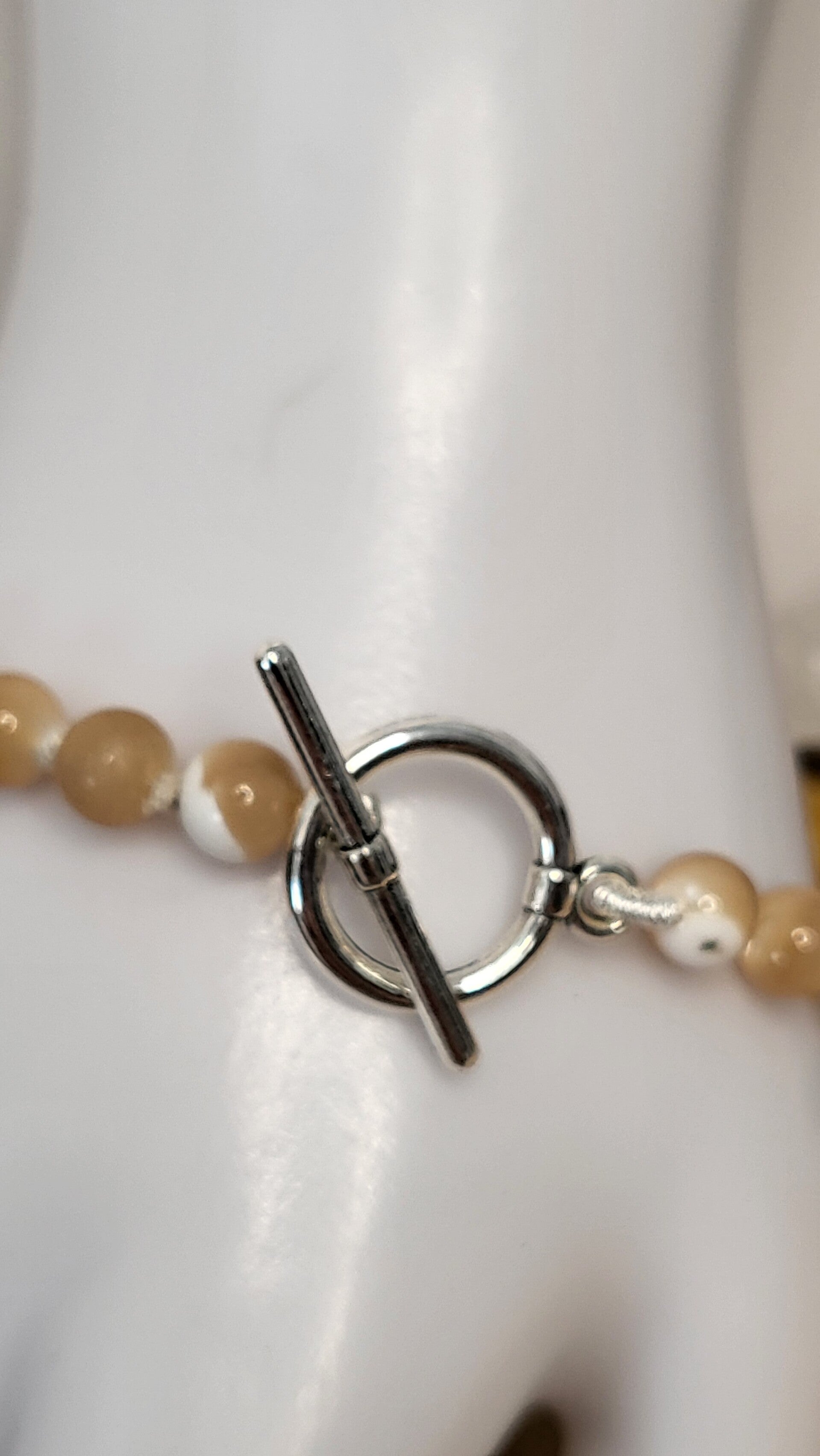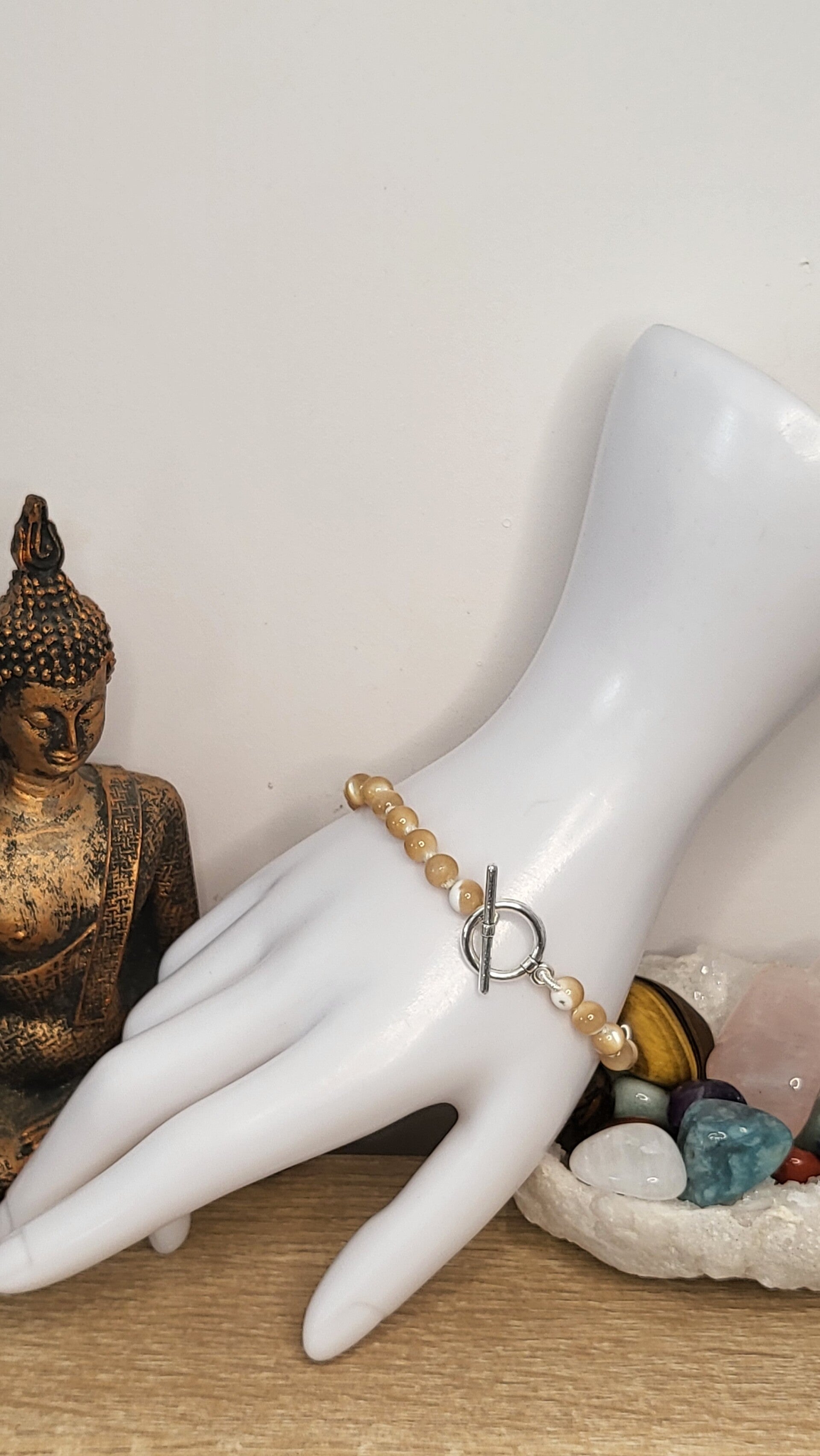Bracelet de 26 perles de nacre naturelle de 6 mm. Montage sur fil DMC perlé écru à noeud entre chaque perle. Longueur de 20cm. Fermoir en alliage métal argenté "Style Hermès.